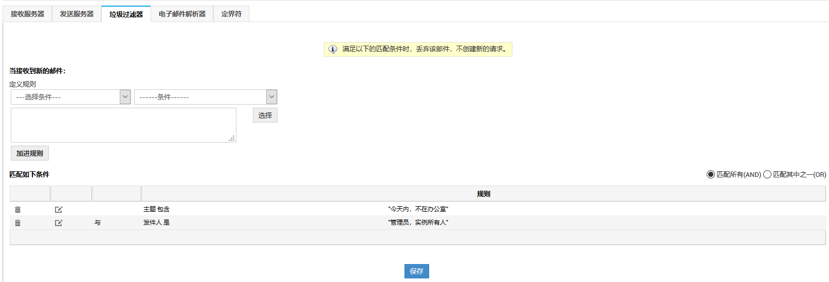 定义过滤条件以阻止任何不必要的或垃圾邮件进入您的收件箱。 符合您定义的条件的邮件将被丢弃,并且不会从中创建任何请求。