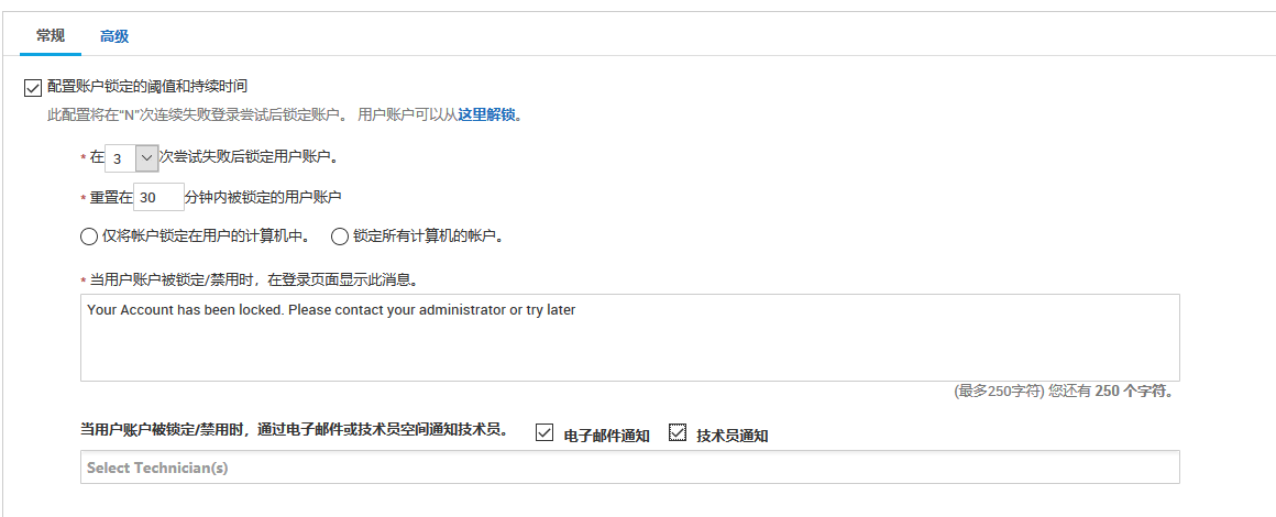 配置帐户锁定阈值和持续时间:管理员可以通过以下方式配置设置:如果用户输入错误的凭据达“ n”次,该帐户将自动被锁定并在登录页面中显示所需的消息。 可以在指定的时间内重置/解锁帐户。 管理员可以通过单击提供的链接并选择“解锁”来解锁帐户。 弹出窗口将显示锁定的帐户及其域和IP地址。