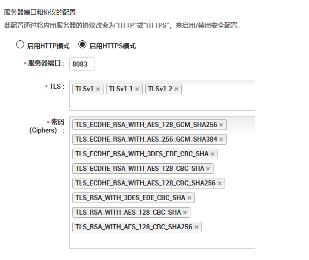 HTTPS:指定服务器端口和NIO端口后,管理员可以从列出的TLS版本和密码中进行选择,以帮助正确加密数据,从而防止黑客窃取数据。