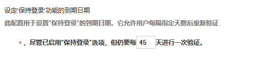 配置“保持登录状态”功能的到期日期:这允许管理员设置持续时间,用户可以保持登录该应用程序的天数。 在到期日,用户必须通过再次输入相同的用户名和密码来重新进行身份验证。 默认情况下,用户必须每45天重新进行一次身份验证。