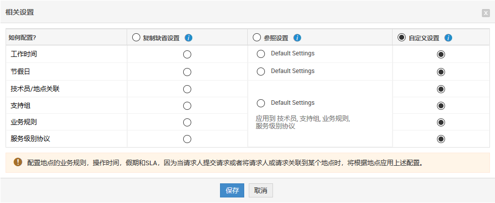 引用设置允许选择并应用不同地点的配置以进行特定设置。 例如,您可以从地点1中选择SLA设置,而从地点2中选择“假期”。
