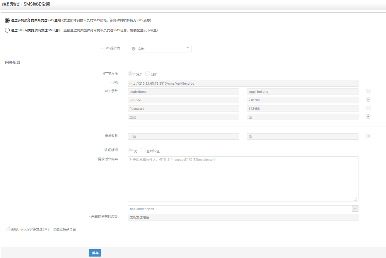 SMS通知设置位于管理>>组织详细信息>> SMS通知设置下。 SMS可以通过两种方式发送: