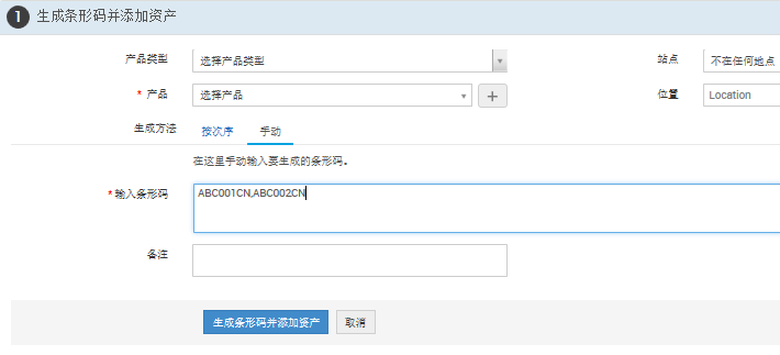 - 输入该资产的有关备注(可选),点击生成条形码并添加资产按钮。