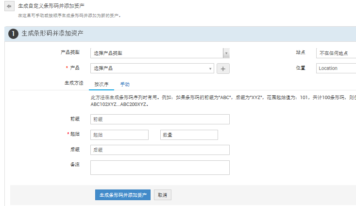 ["通过生成自有的条形码来添加资产"] 图标,进入相应的页面。