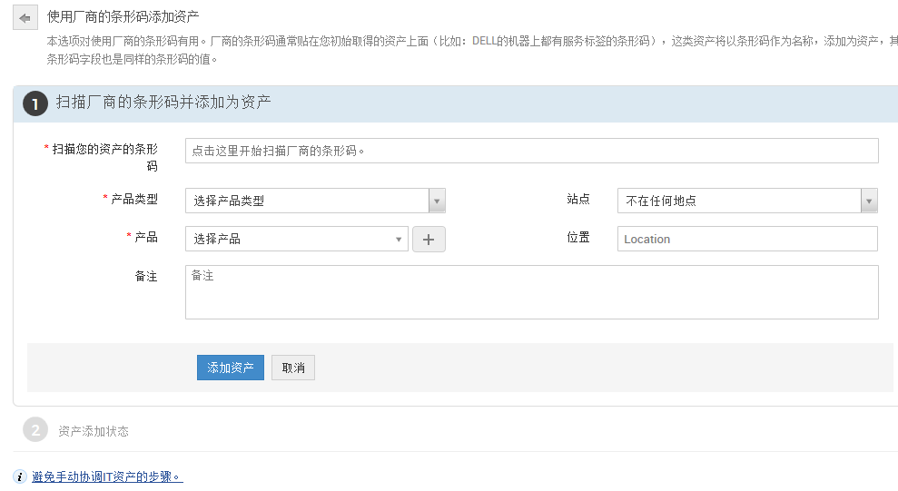 ["使用厂商条形码添加资产"]的图标,进入添加资产的页面。