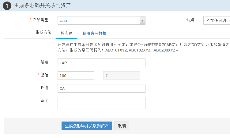 此方法可以一系列资产生成条形码。可以设置条形码的前缀、后缀、起始数字和资产数量,然后将按照所给定的值,生成一系列的资产条形码。