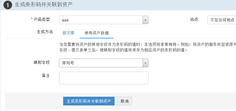 如果要使用已有资产的数据来生成条形码,可选择本方法。这时需要选择使用的资产数据的对应字段。比如:使用资产的服务标签/序列号字段的值来生成条形码。