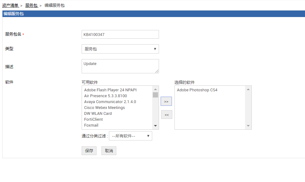 此时,可以修改服务包的名称、类型及描述。也可以添加软件、服务包到已有的服务包列表中。