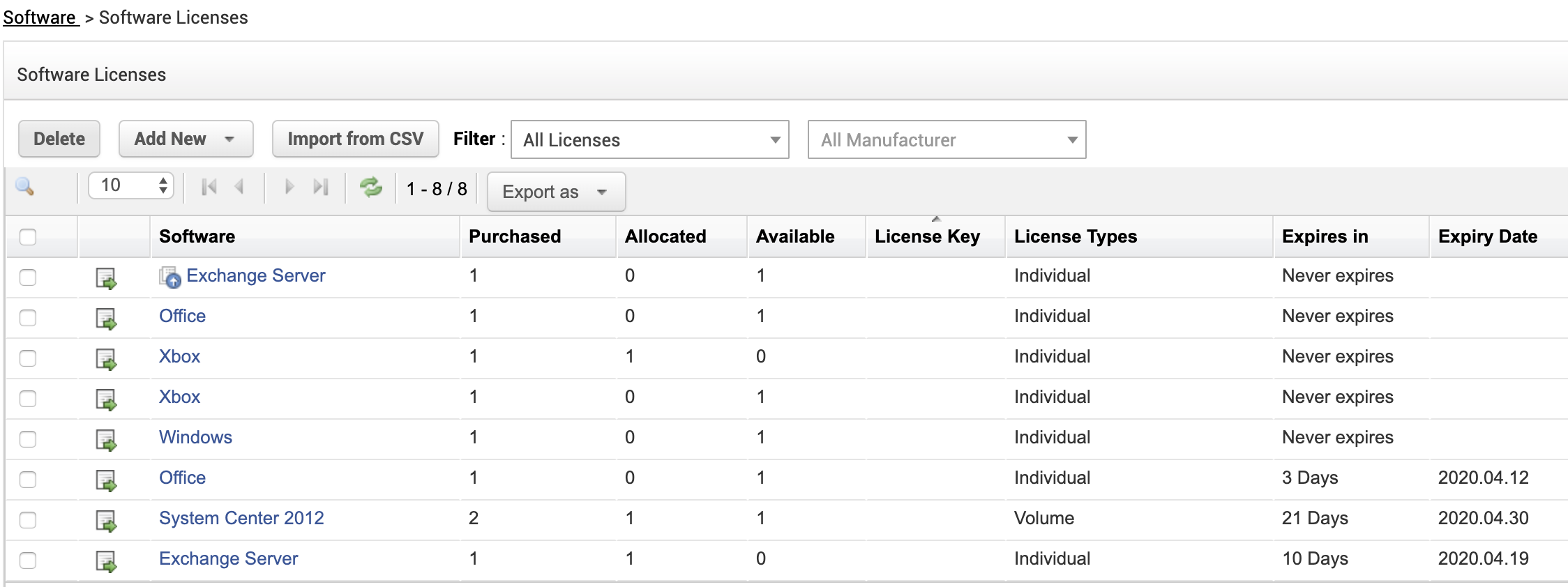 软件许可证列表视图