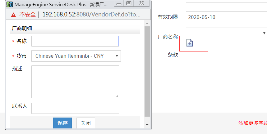 ,在弹出的对话框中输入厂商名称及描述,结算货币、联系人信息之后保存。