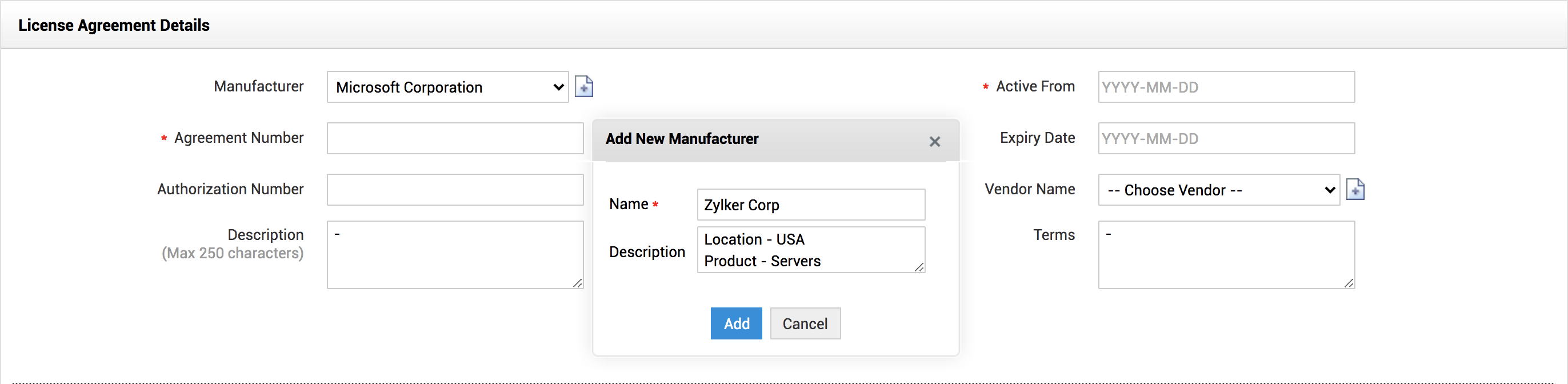 ManageEngine ServiceDesk Plus 提供了一个选项,可通过在application中添加许可协议,在数据库中维护许可协议。您还可以将许可协议与软件许可证关联。