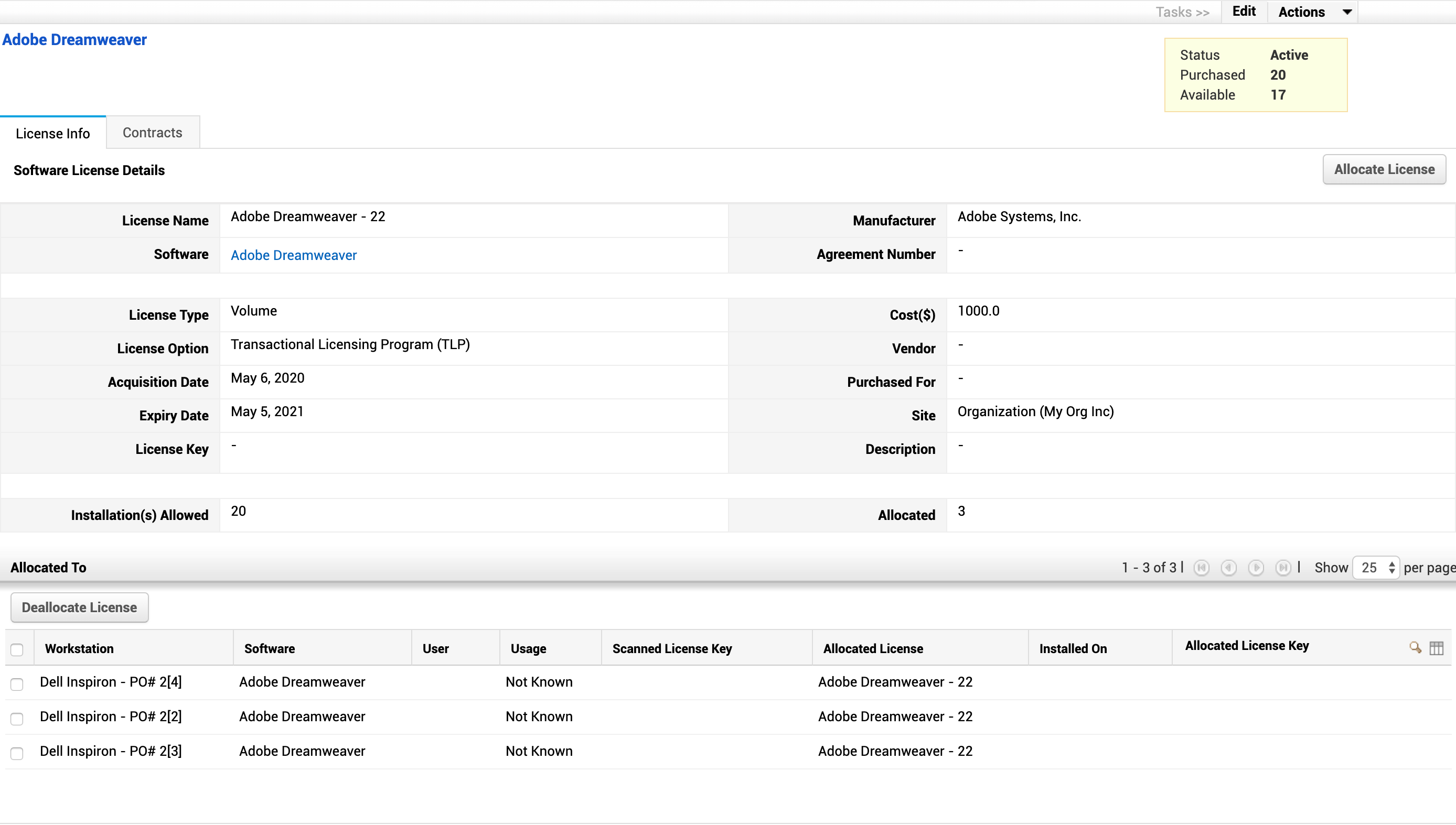 合同:此选项卡显示与该软件关联的合同。这些合同是通过“合同”选项卡添加的。[请参见 添加合同以了解更多详细信息]