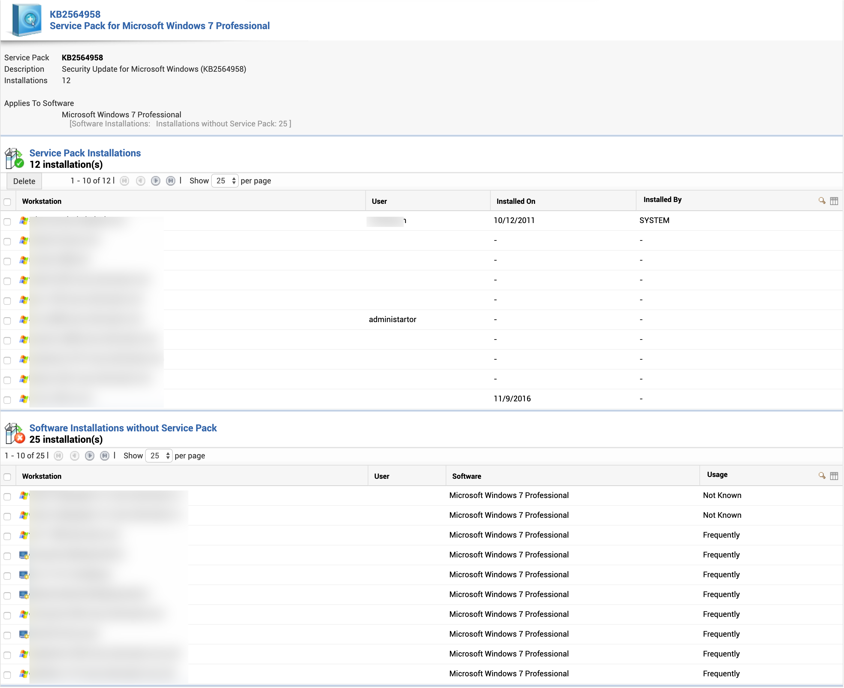 在此模块下,您可以获取所有 Service Pack 安装的列表,包括工作站名称、用户名、安装时间和安装者等详细信息。