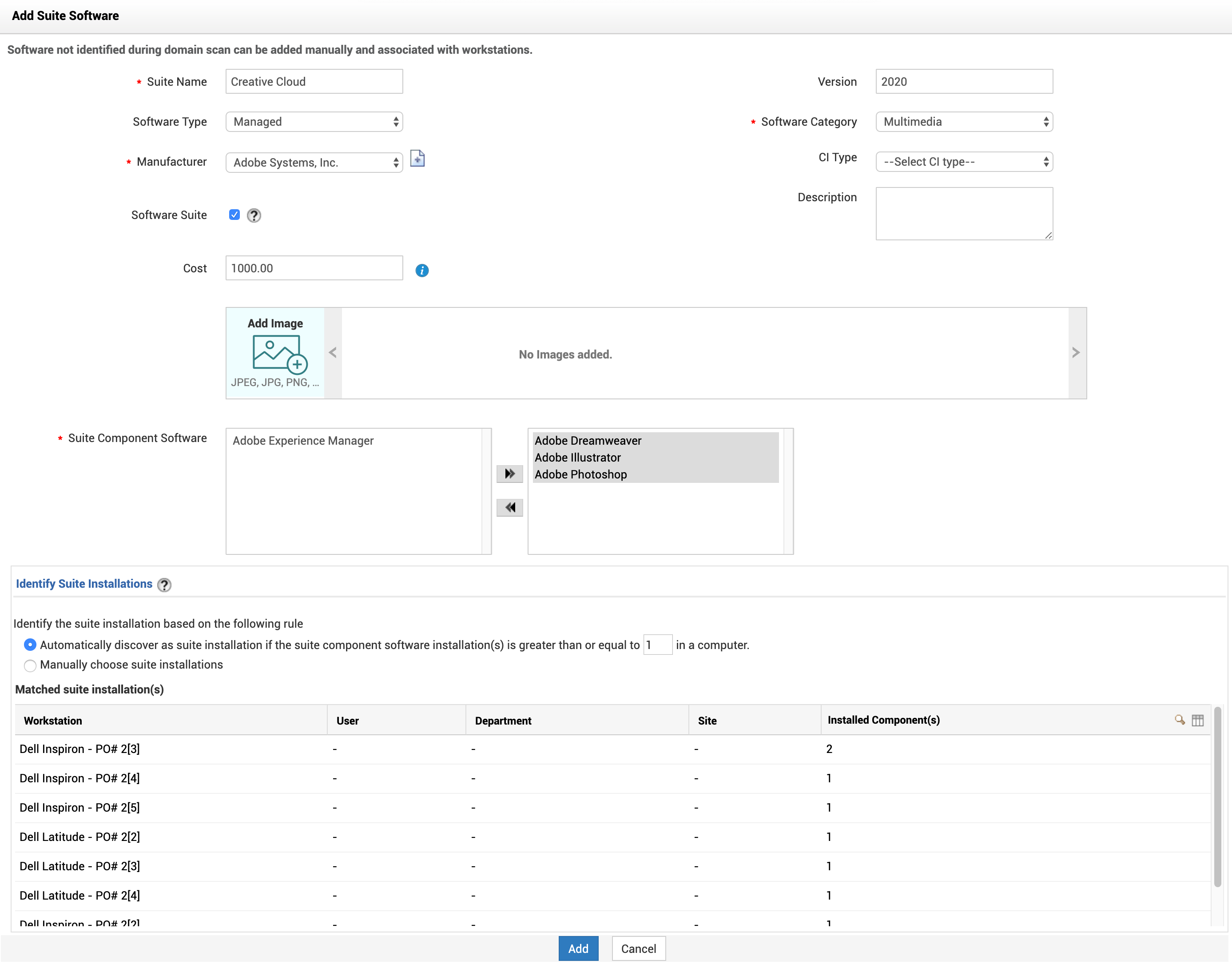 单击 新建,选择 软件套件, 填写显示的表单,如下表所述,然后单击 添加。.