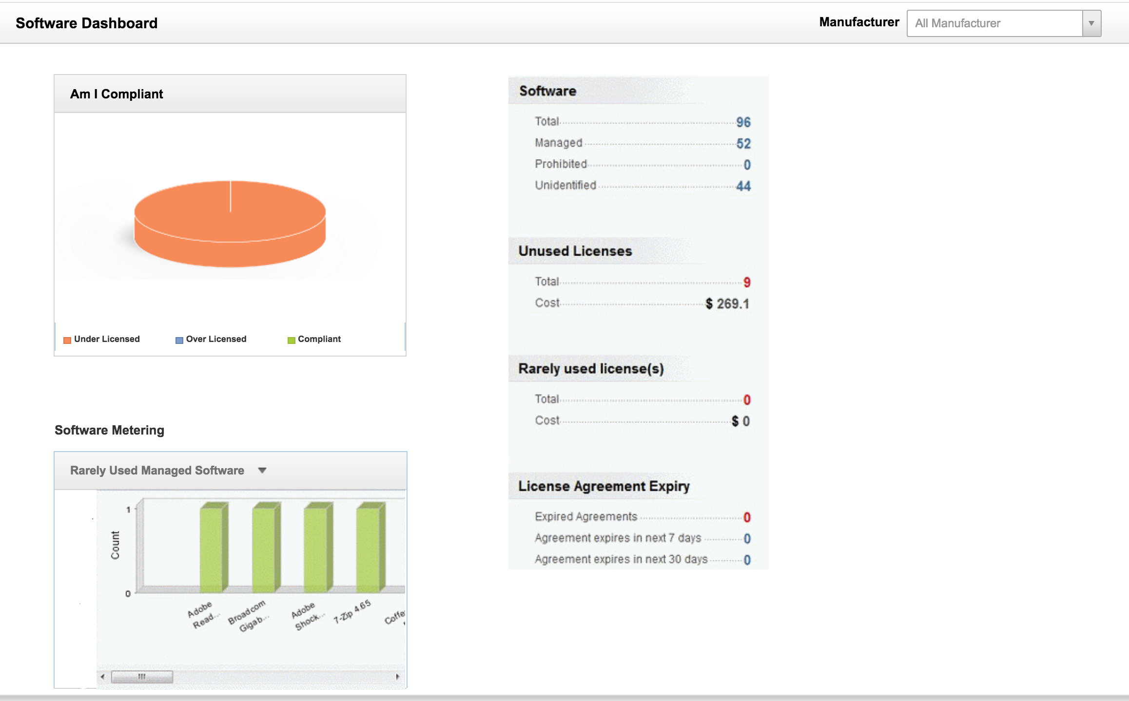 ServiceDesk Plus 会扫描您的网络,并自动发现工作站中所有可用的软件。在软件仪表板中,资产管理员可以: