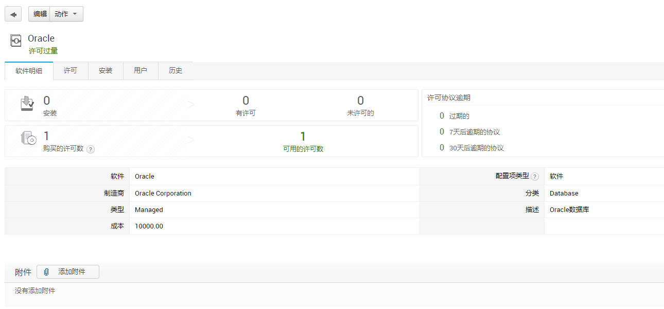 软件详细信息页面有5个选项卡,其中包含软件详细信息选项卡(默认选中),显示监视软件所需的重要信息,如未许可安装和许可协议到期等。
