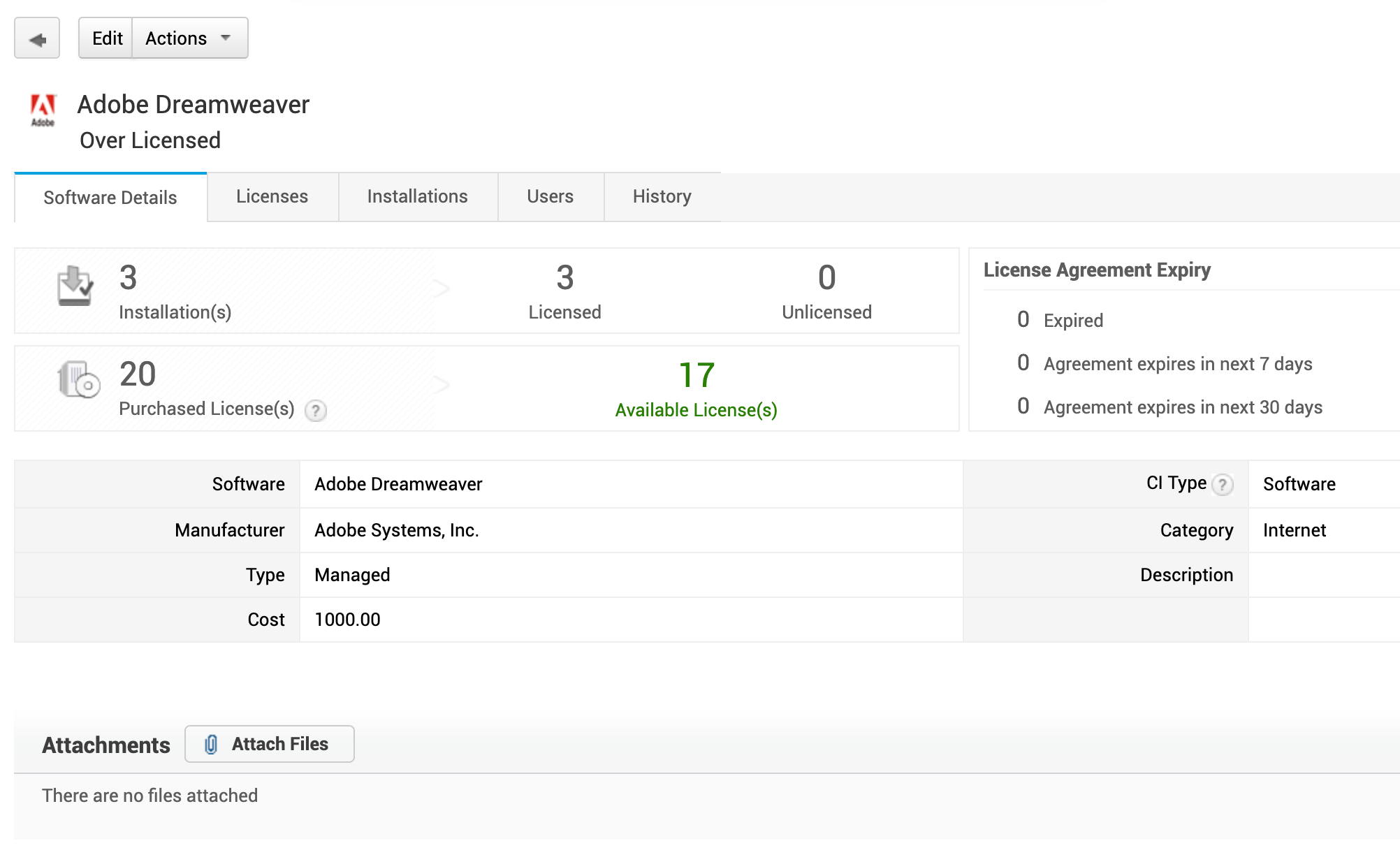 许可证:在此,您可以查看与软件关联的许可证以及其他各种详细信息,如许可类型、可用许可证数量、许可证总数等,具体取决于所选许可证 [参见:许可证类型]。您还可以通过单击操作下拉菜单并选择新建 --> 标准/升级许可证,从此页面添加/删除新许可证,并将这些许可证分配给未授权的工作站。[有关添加许可证的更多信息,请参见:添加软件许可证]