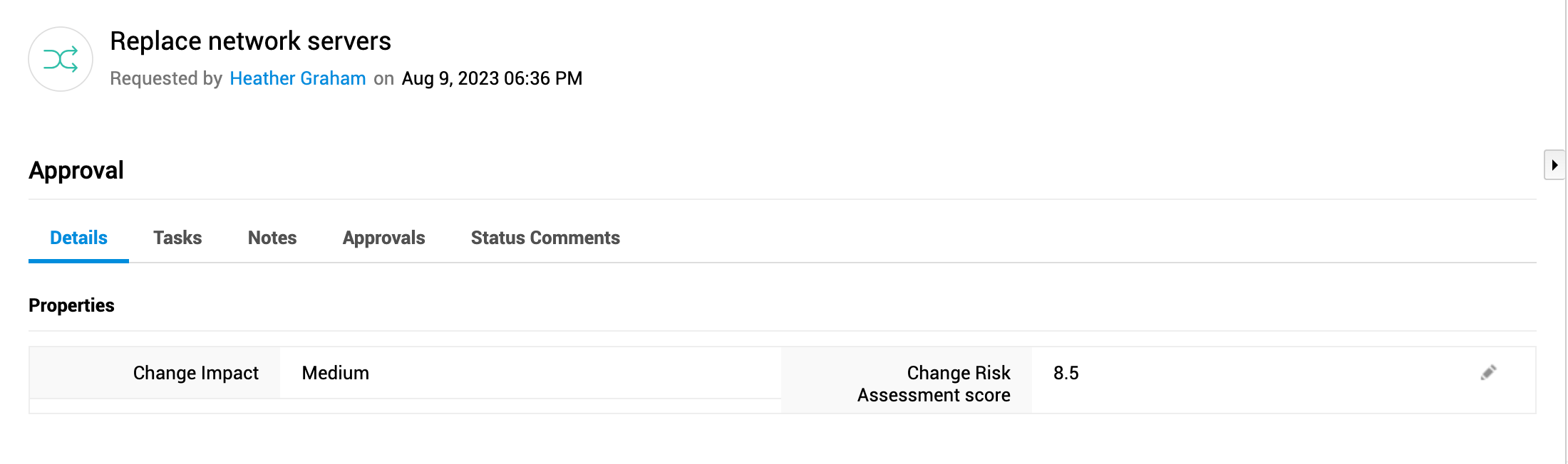 详细信息子选项卡会显示实施变更的预估成本。根据您的变更角色和权限,您可以快速编辑成本字段。