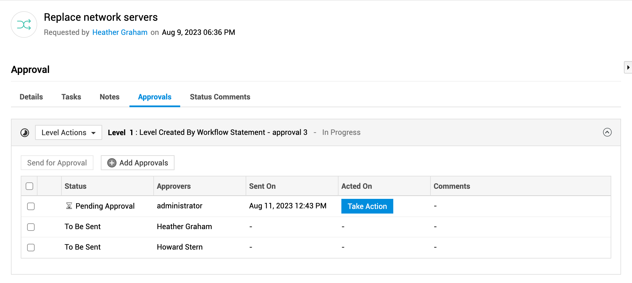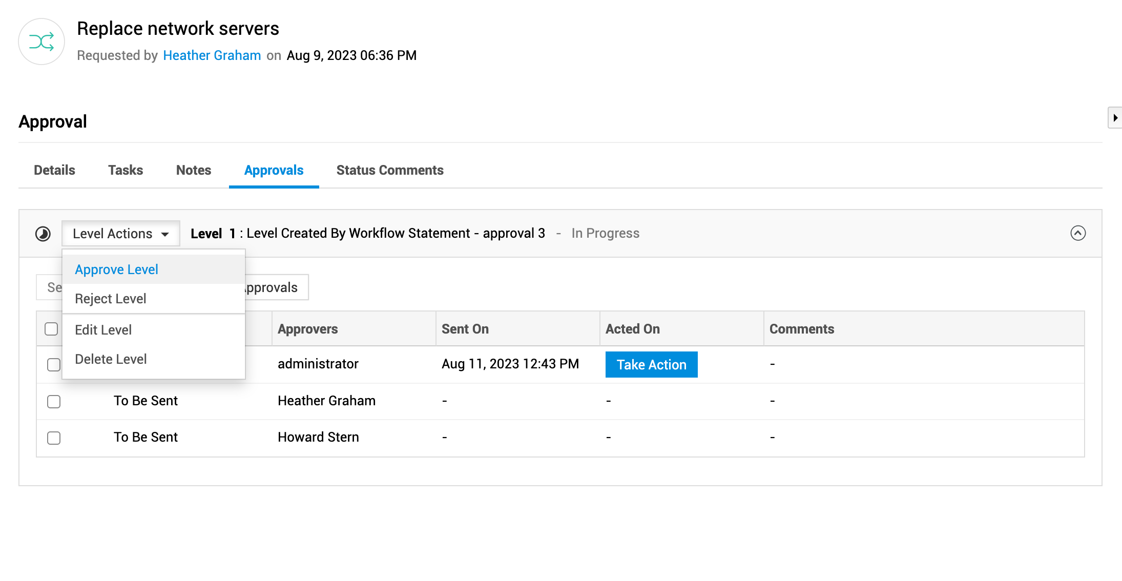 在级别操作下拉菜单中,您可以根据权限批准、拒绝、编辑或删除审批级别。
