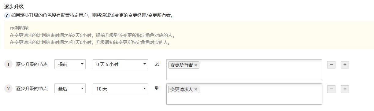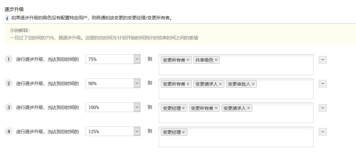 8.当对“是否要定义解决时间?”选择“否”时,升级由“计划开始”和“计划结束”'时间之间的总时间的百分比定义。选择变更请求逐步升级需要达到总时间的百分比(例如75%),以及要向其发送升级通知的“变更角色”。