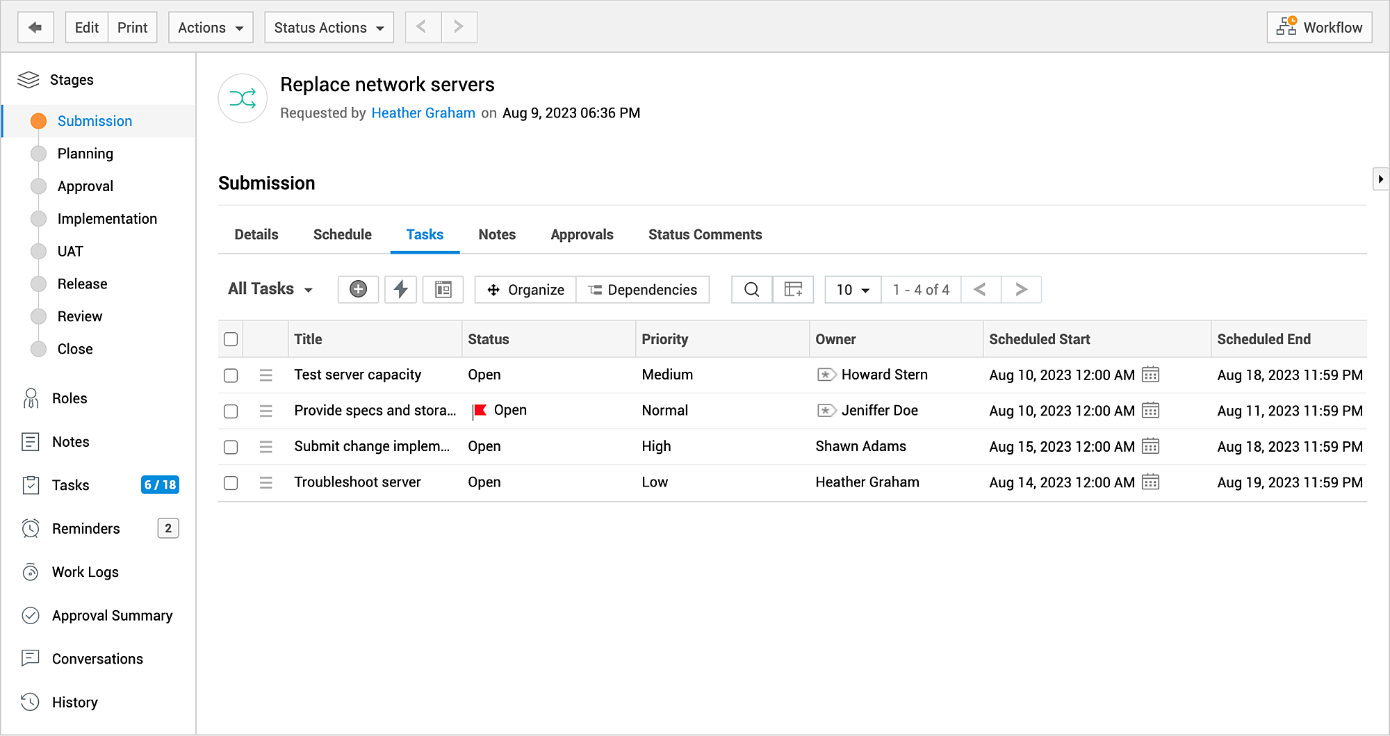 任务可确保与变更相关的所有活动都有序执行。ServiceDesk Plus 允许您跟踪每个变更阶段中的任务,将任务分配给不同的技术人员,并根据需要对其进行组织和触发。