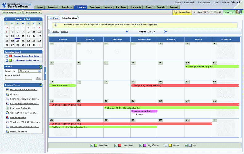 变更日历视图,是按照变更的计划开始时间和计划结束时间,在日历中显示相应的变更。不同类型的变更将以不同的颜色显示。