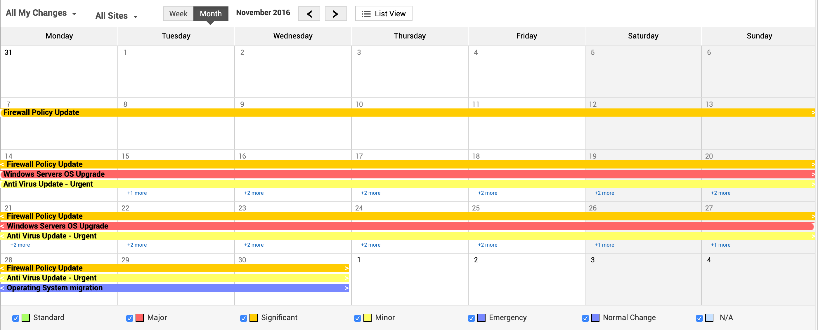在页面底部,显示所有四种更改类型以及一种 N/A 类型,并附带复选框。例如:如果您只想在日历视图中查看当月的标准更改,请选中“标准”复选框并取消选择其他更改类型。如果您希望查看所有更改类型,则启用所有更改类型对应的复选框。