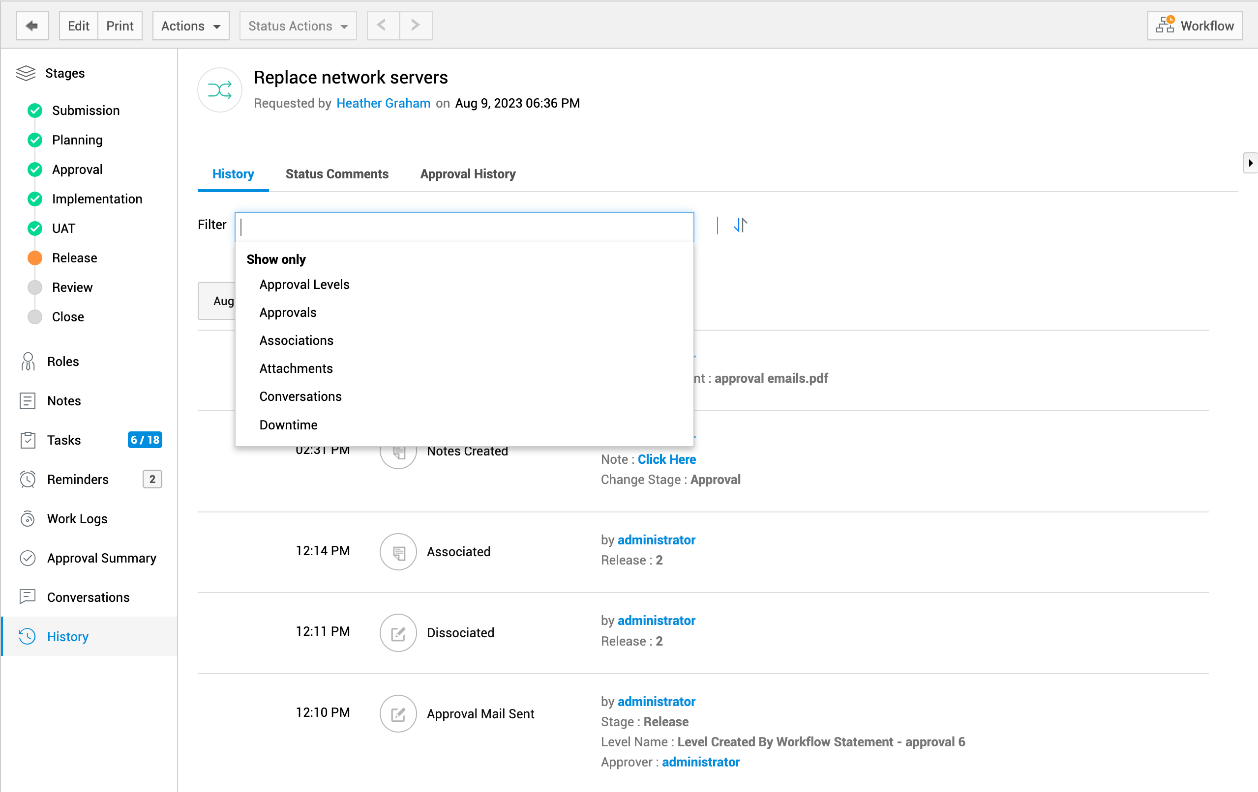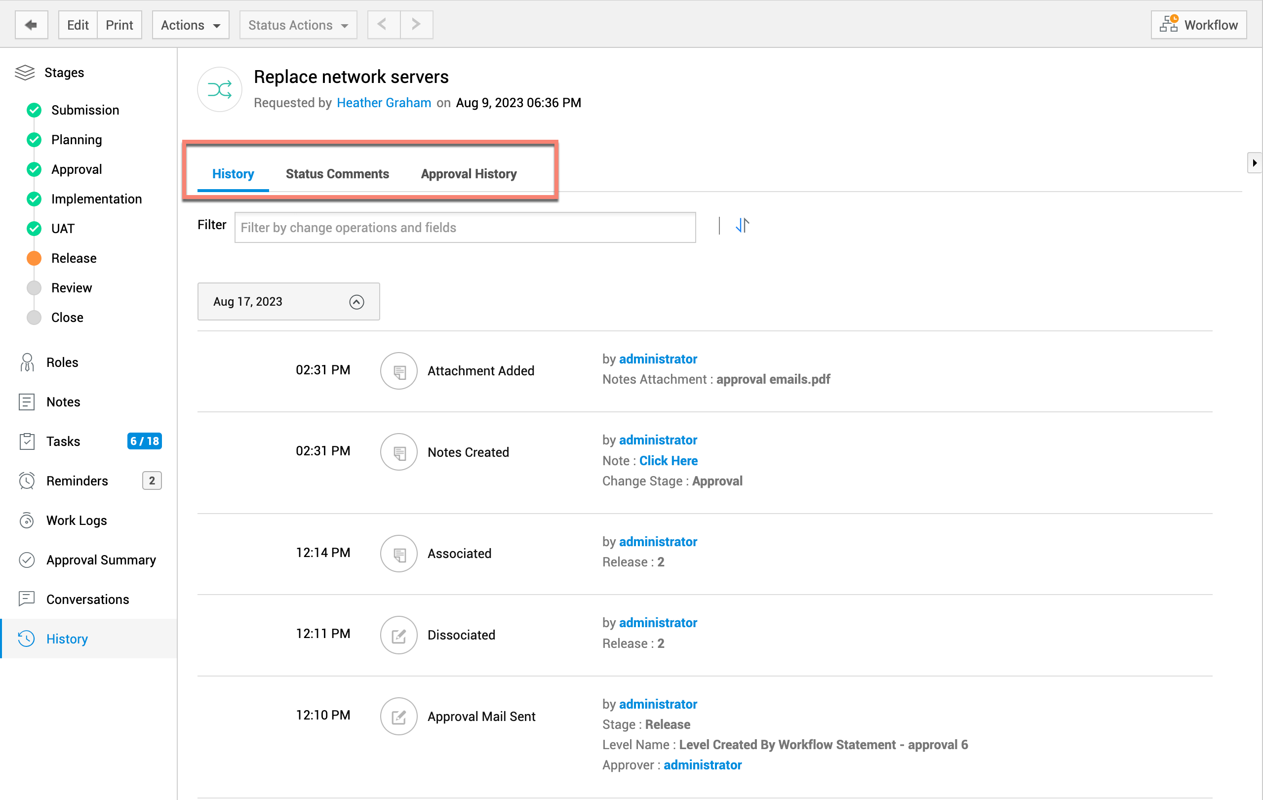 所有更改阶段的状态注释和审批历史记录也会在更改历史记录的相关选项卡下列出。