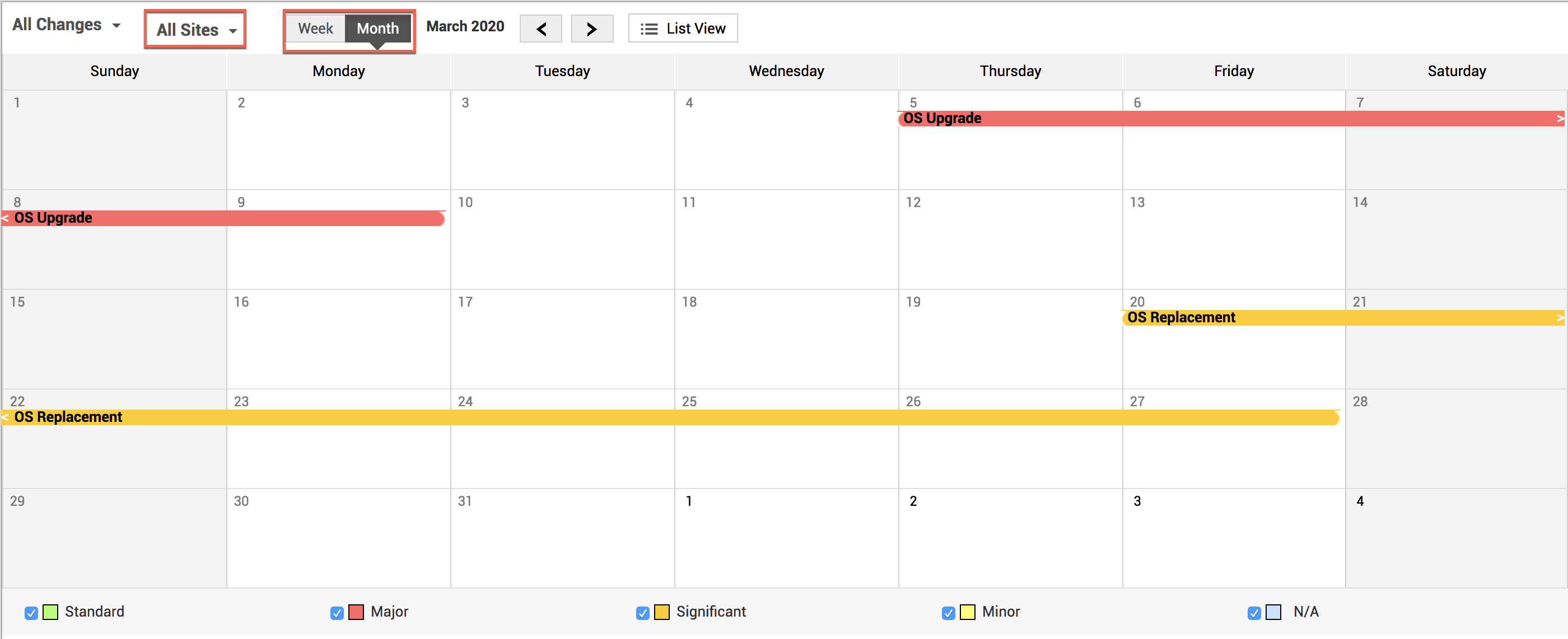 日历视图可帮助您在周历和月历中一目了然地查看各种变更的计划安排;并可根据站点和变更类型自定义显示内容。