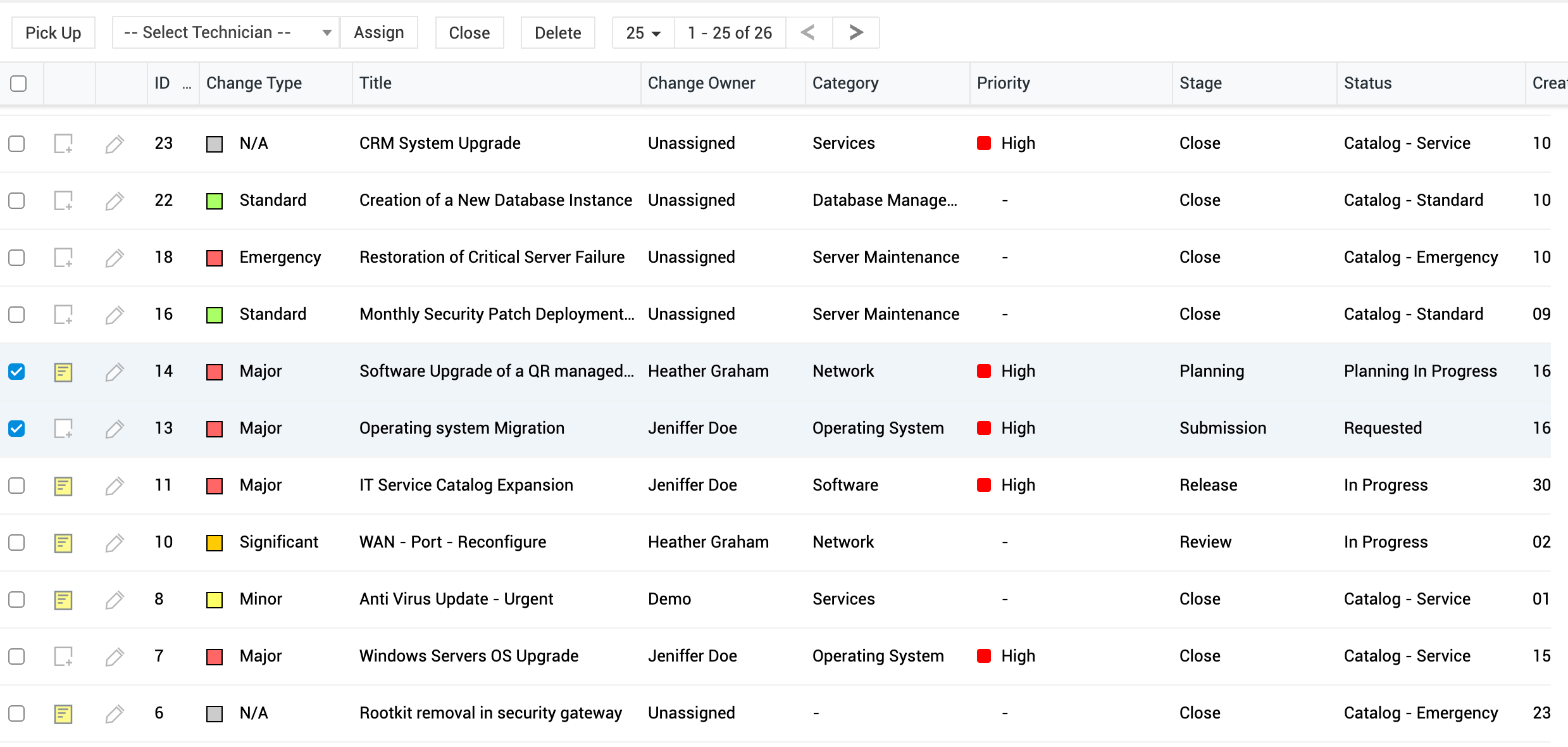 执行批量操作,例如领取和删除变更,以及分配技术人员。(您分配的技术人员将成为该变更的所有者。)