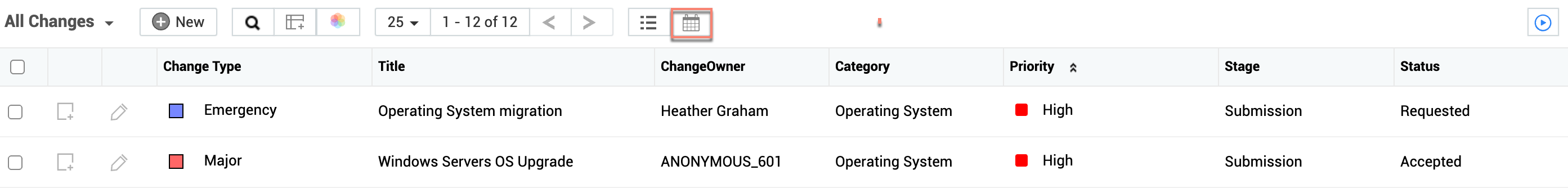 变更模块提供两种视图,即列表视图和日历视图,其中变更列表为默认视图。虽然这两种视图提供了一些通用的显示和操作,但它们用于不同的目的。