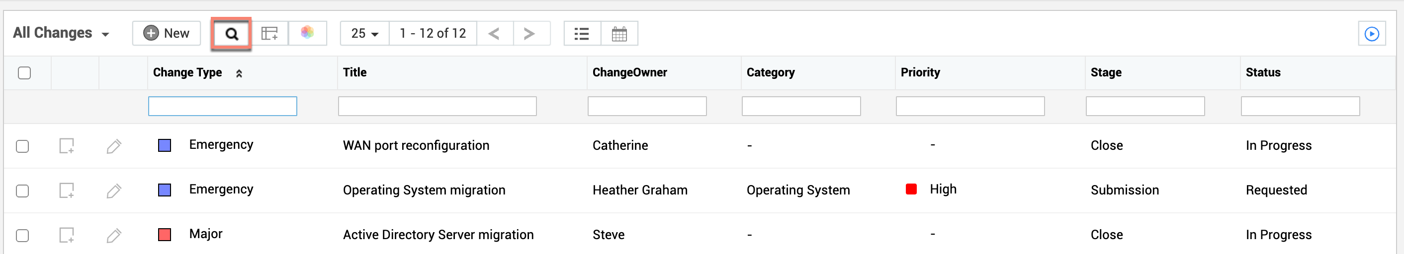 除了全局搜索外,您还可以按列搜索变更。例如,您可以按站点、所有者、紧急程度等搜索变更。单击菜单栏中显示的搜索图标