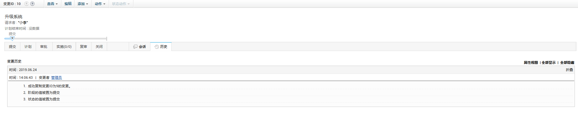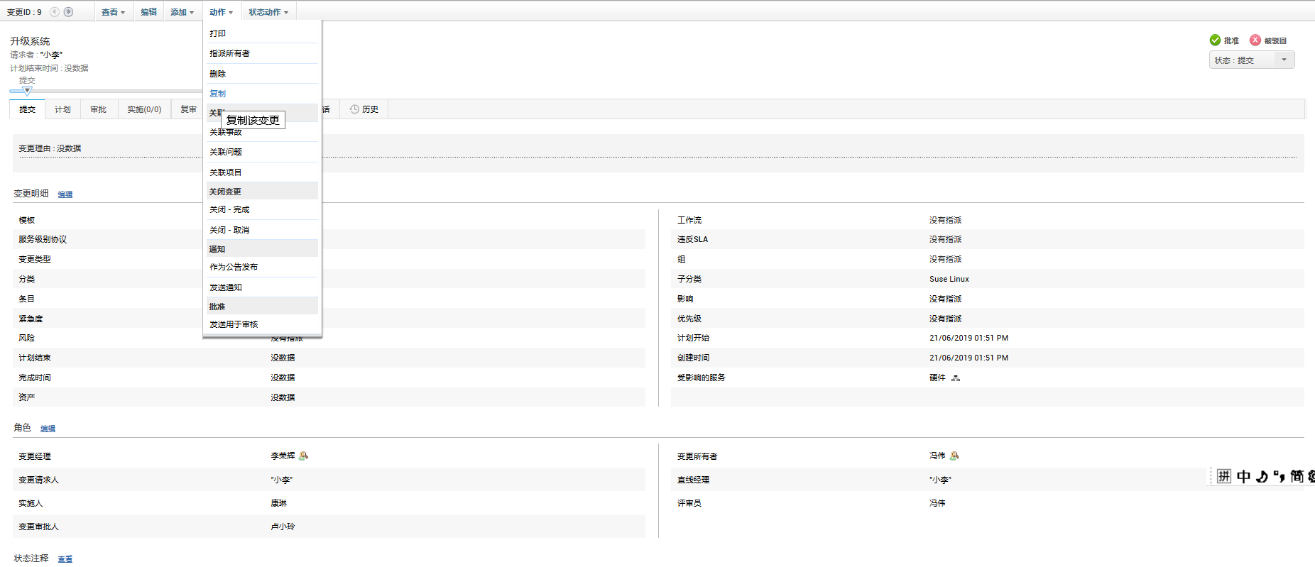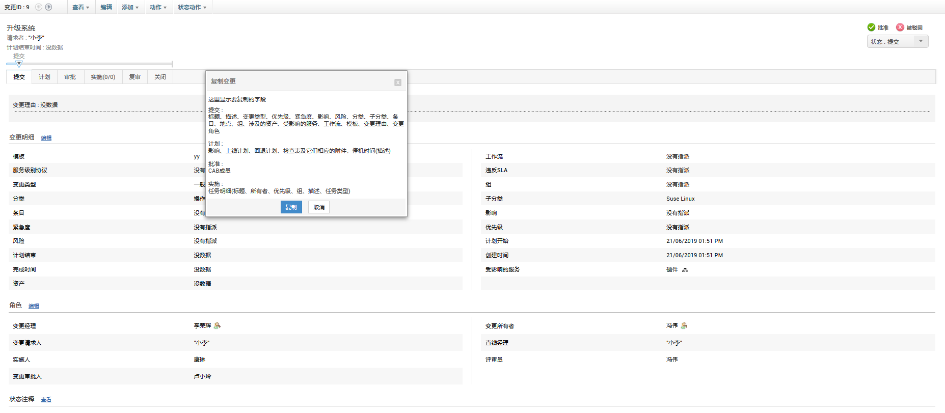 设想一下,当软件(如SDP、SAP)需要升级到较新版本时,我们必须创建一个变更并在测试环境中执行升级操作。在升级生产设置时,我们需要创建一个变更,类似于为测试环境创建的变更。操作菜单下的复制选项可用于为生产设置创建变更。