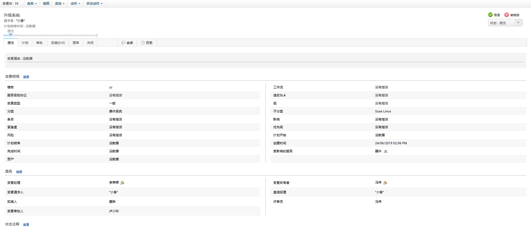 | 提交 | 标题、说明、变更类型、优先级、紧急程度、影响、风险、类别、子类别、项目、网站、组、涉及的资产、受影响的服务、工作流、模板、变更原因、变更角色 |