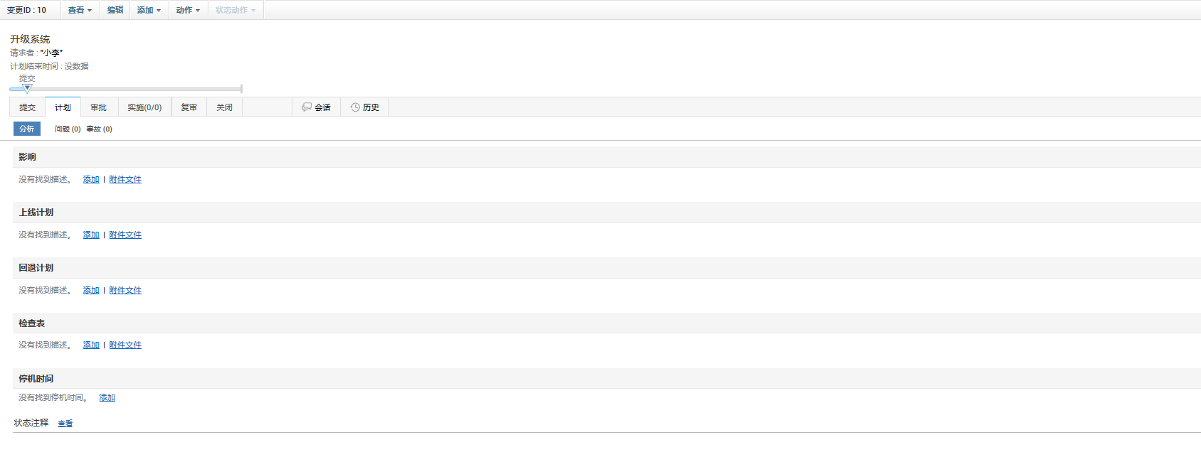 | 计划 | 影响、上线计划、备份计划、附有对应附件和停机时间的检查表(说明) |