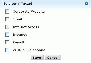 ,从列表选择受影响的IT服务。将弹出受影响的服务窗口(如下图所示),选择受影响的IT服务,保存设置。