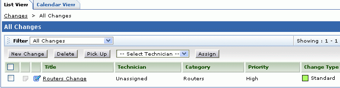 变更主页显示两种视图,即列表视图和日历视图。列表视图以列表形式显示所有变更。日历视图显示开放、有计划开始和结束时间、以及由变更经理批准的变更。在日历中,根据变更的类型,用不同的颜色标记。