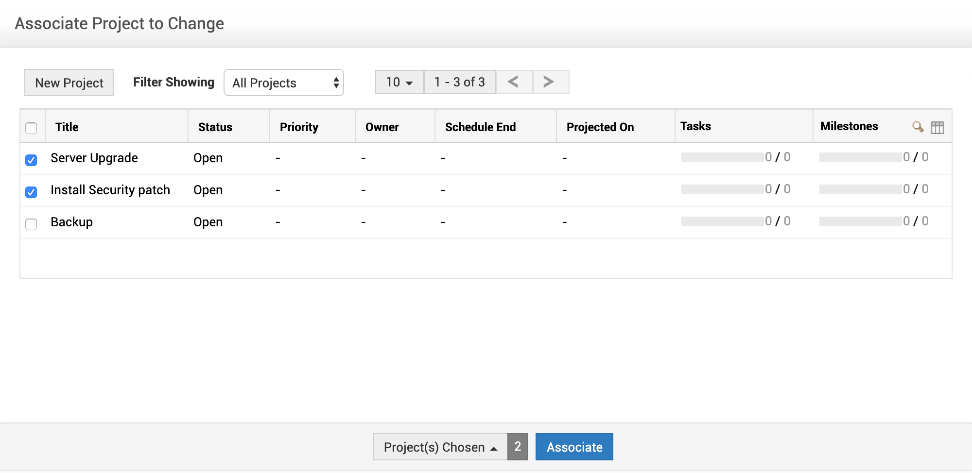 可以创建一个用于实施该变更的新项目,并将其与该变更关联。除了为实施变更创建新项目和任务外,已存在的项目(例如为类似当前进行中的变更而提前开展的项目)也可以与该变更关联。