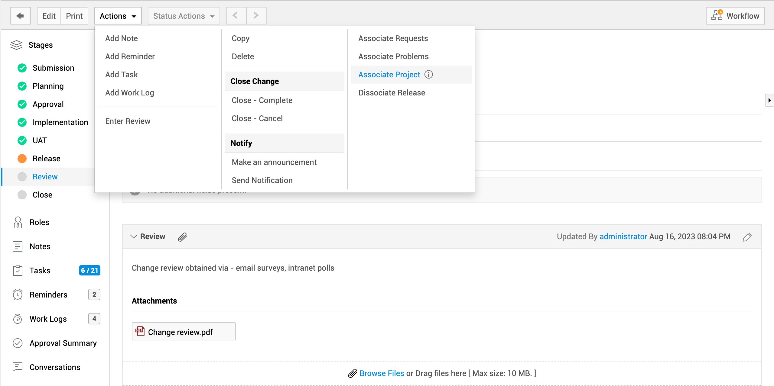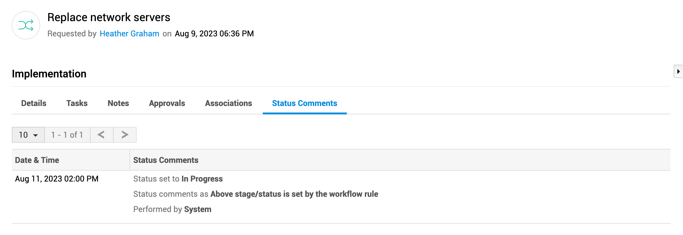 查看更改在实施阶段的状态流转,以及流转过程中添加的评论。