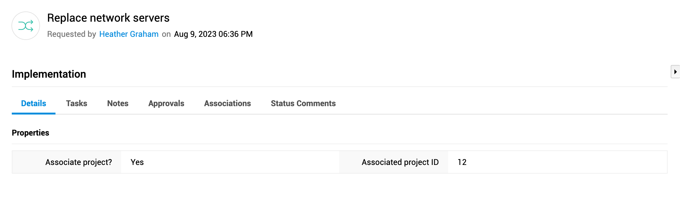 详细信息子标签页显示为收集更改实施流程信息而配置的任何附加字段。根据您的更改角色和权限,您可以快速编辑该附加字段。