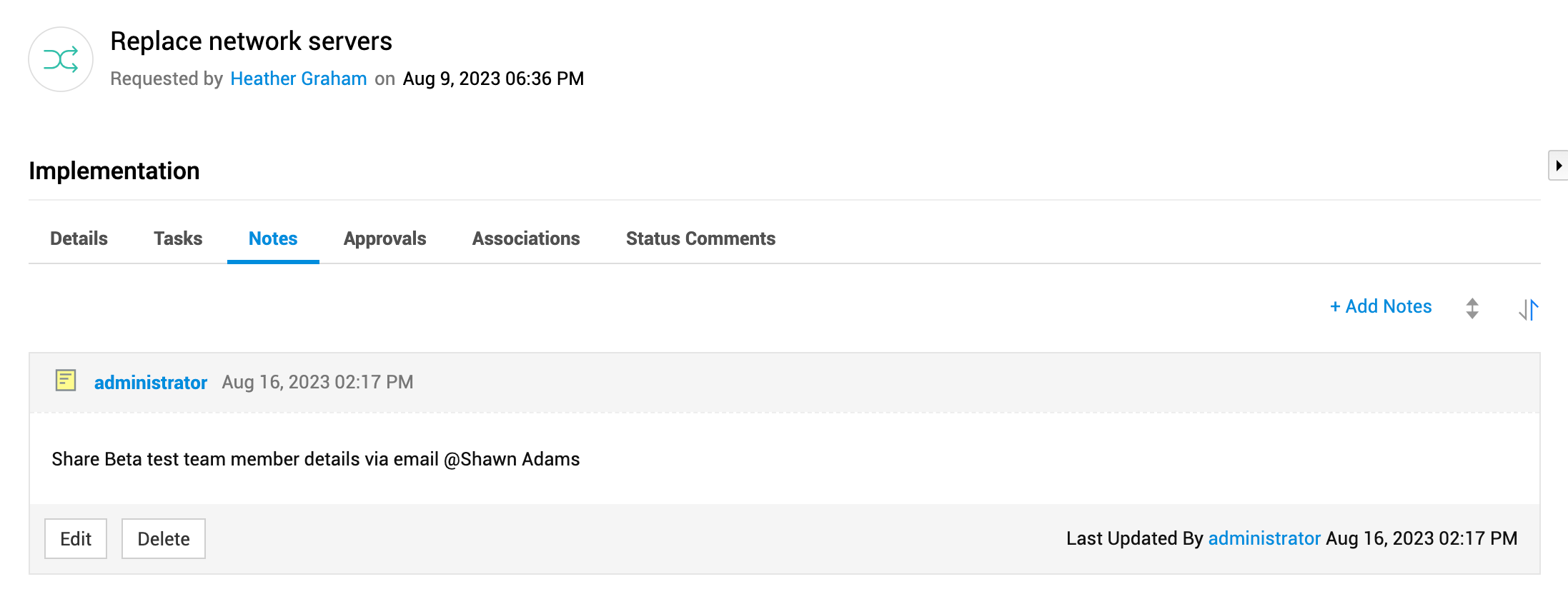 技术人员可以添加备注,补充有关更改实施的重要信息,并标记用户以通知他们。
