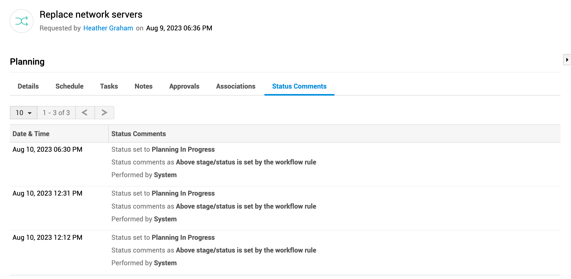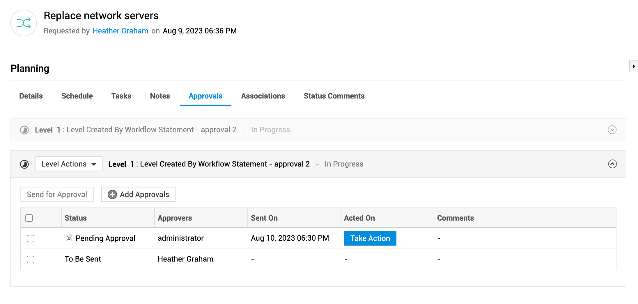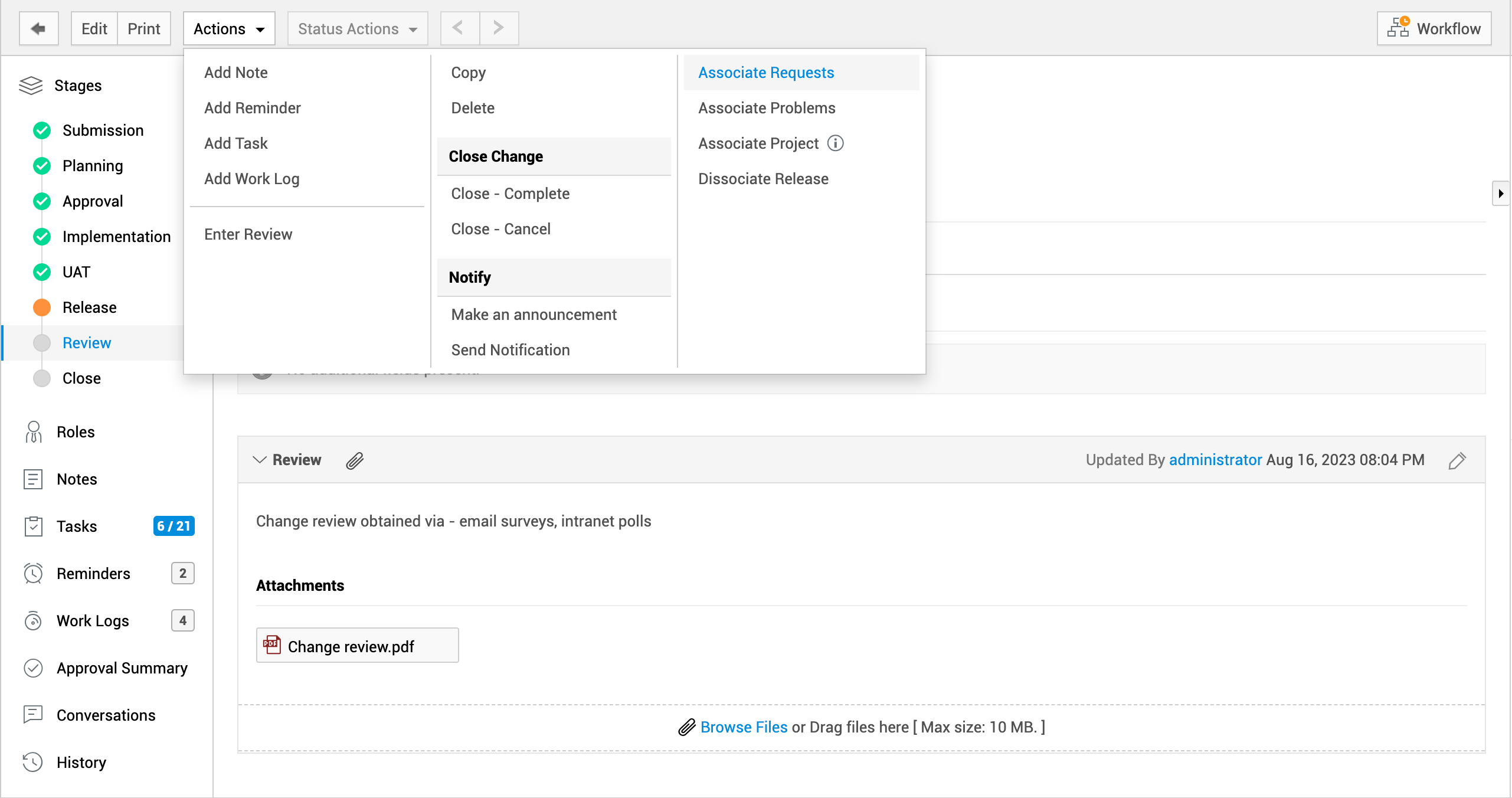 通过工作流跟踪与规划阶段关联的审批级别。根据您的权限,您可以对变更执行审批操作。