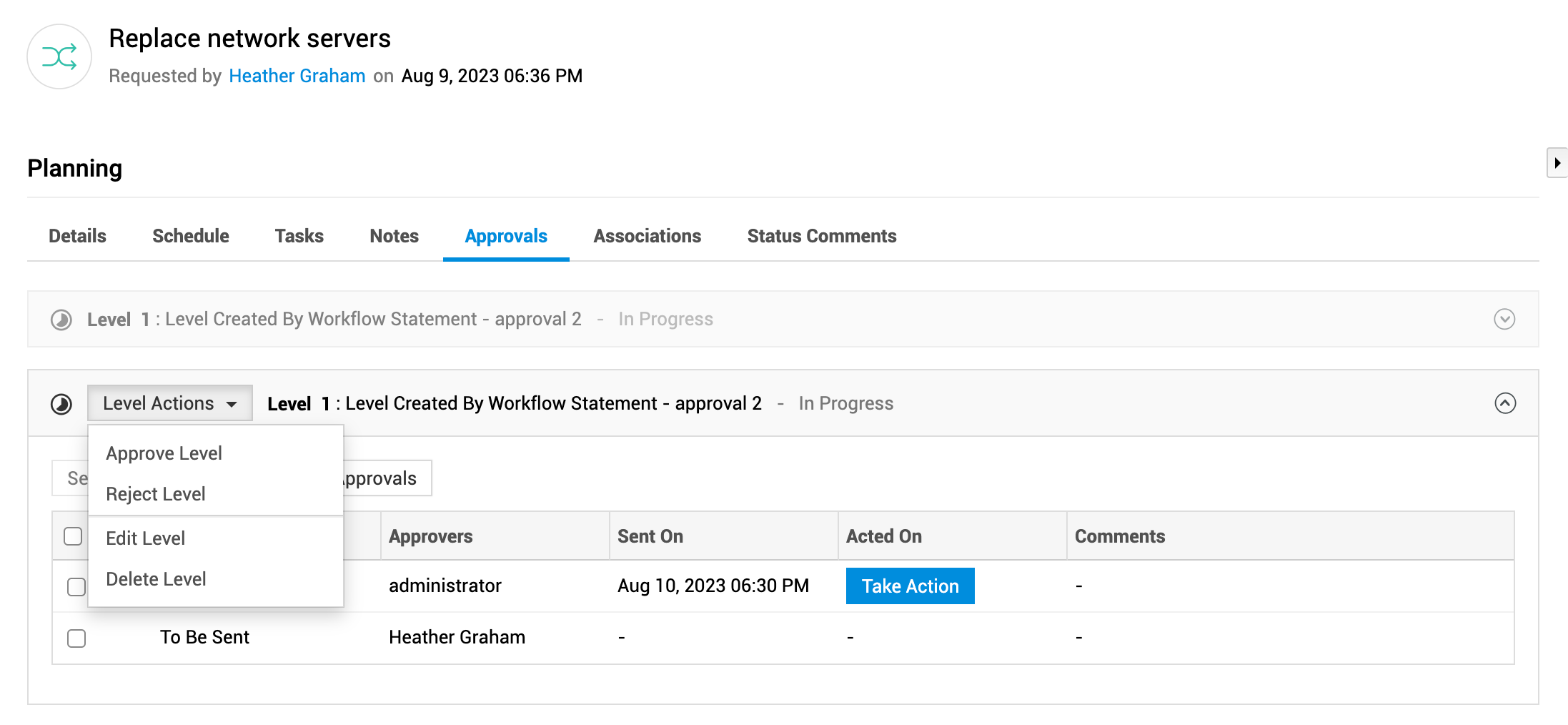 从级别操作下拉菜单中,您可以根据权限批准、拒绝、编辑或删除审批级别。