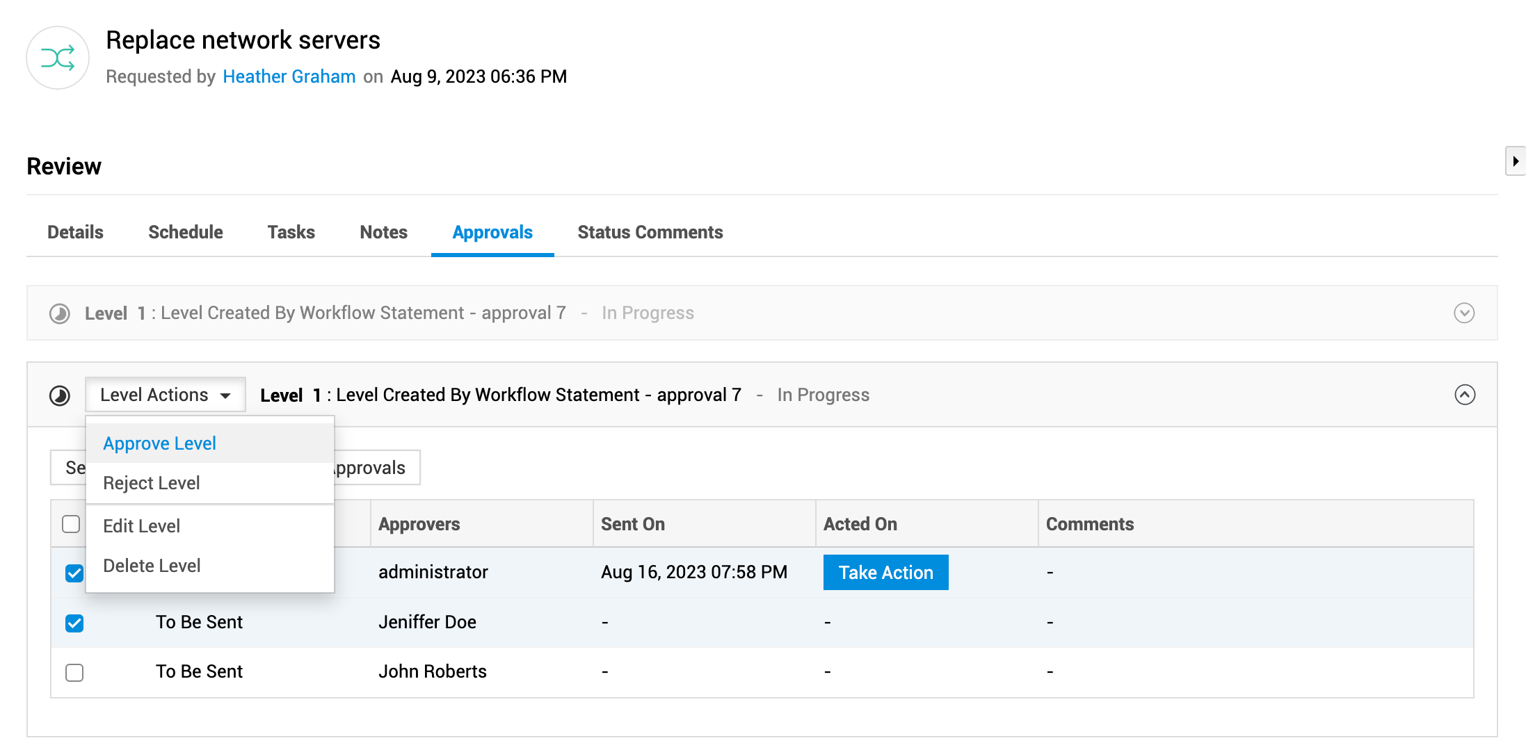 在级别操作下拉菜单中,您可以根据自己的权限批准、拒绝、编辑或删除审批级别。