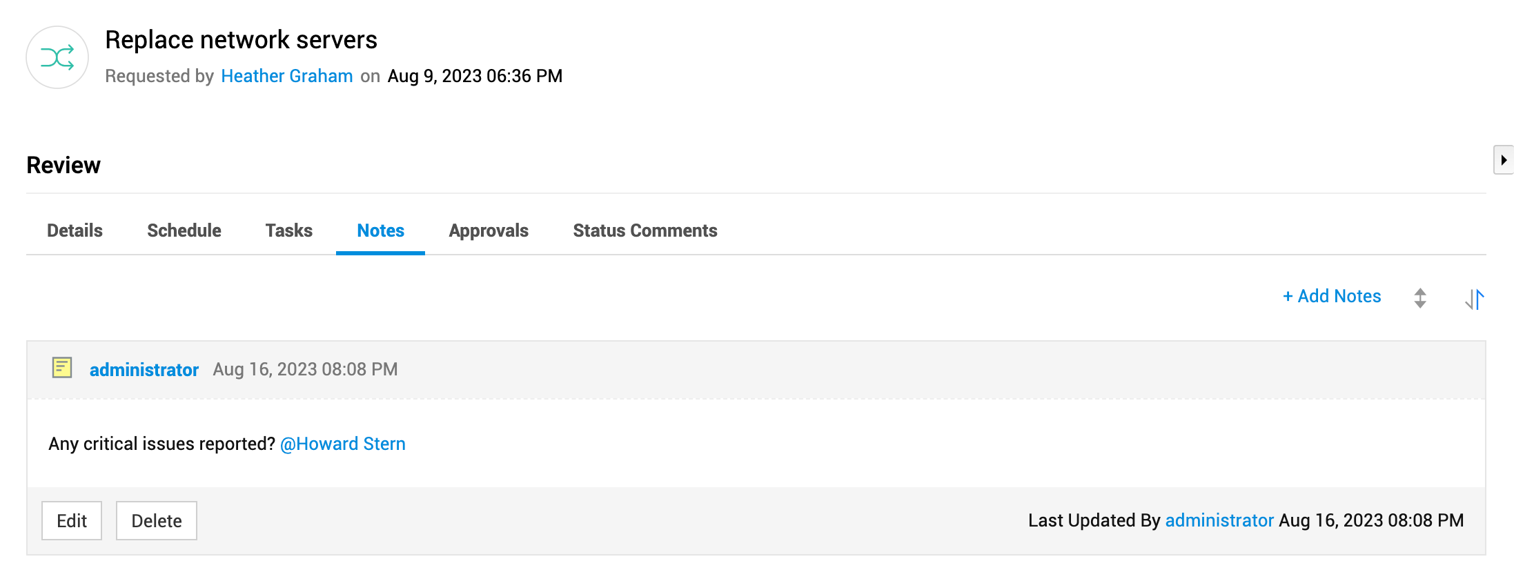 技术人员可以添加备注,以补充与变更审查相关的重要信息,并标记用户以通知他们。