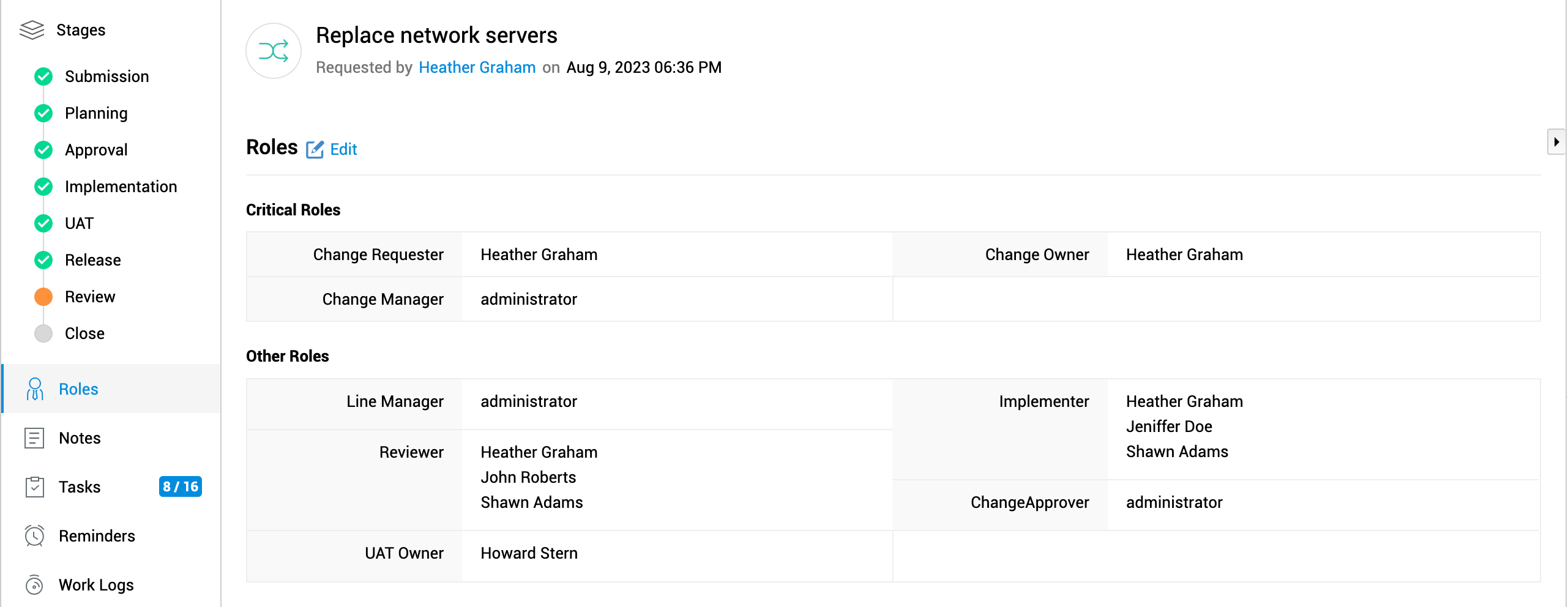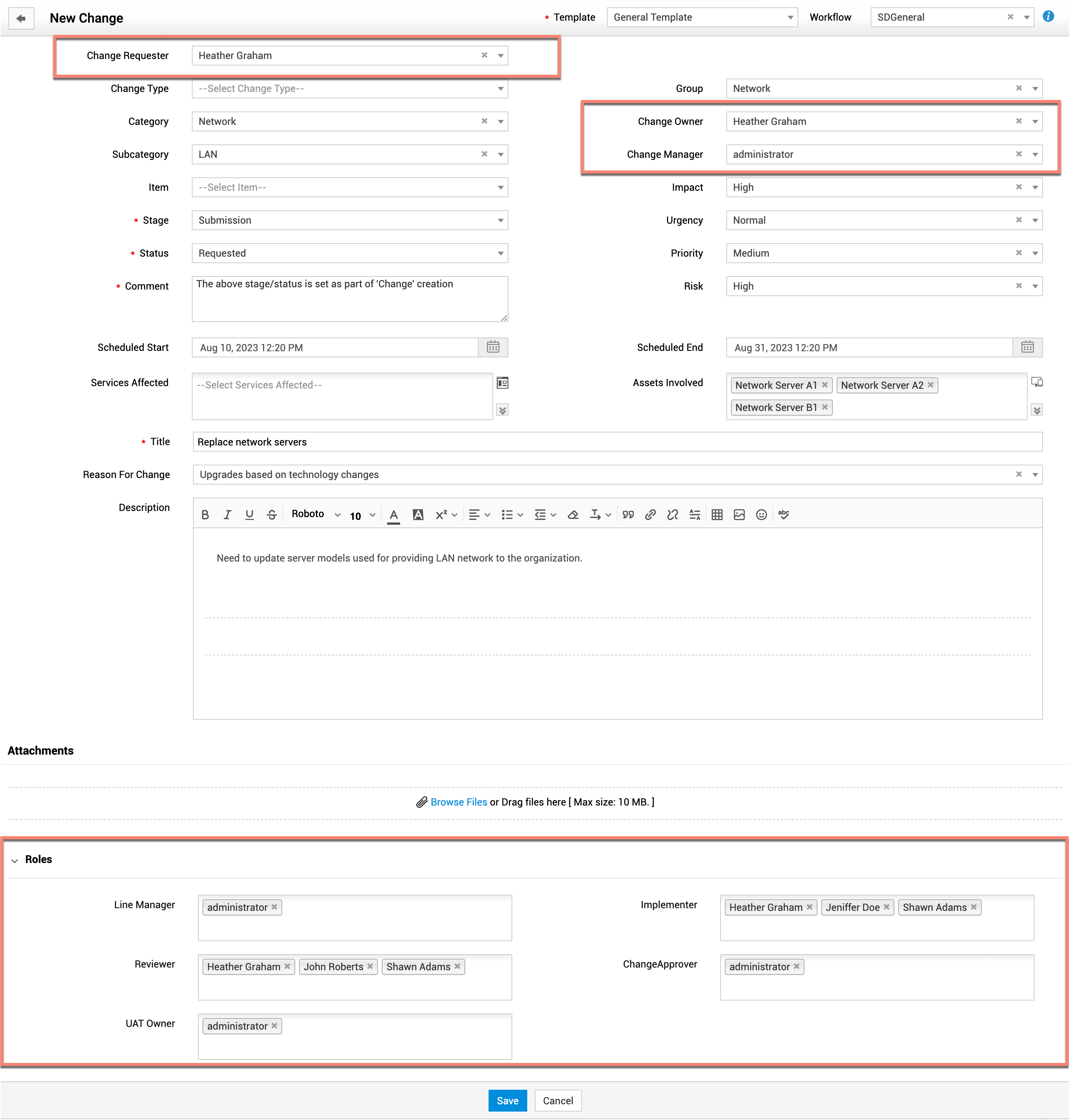 在创建或编辑变更请求时,您可以将技术人员分配到变更角色。