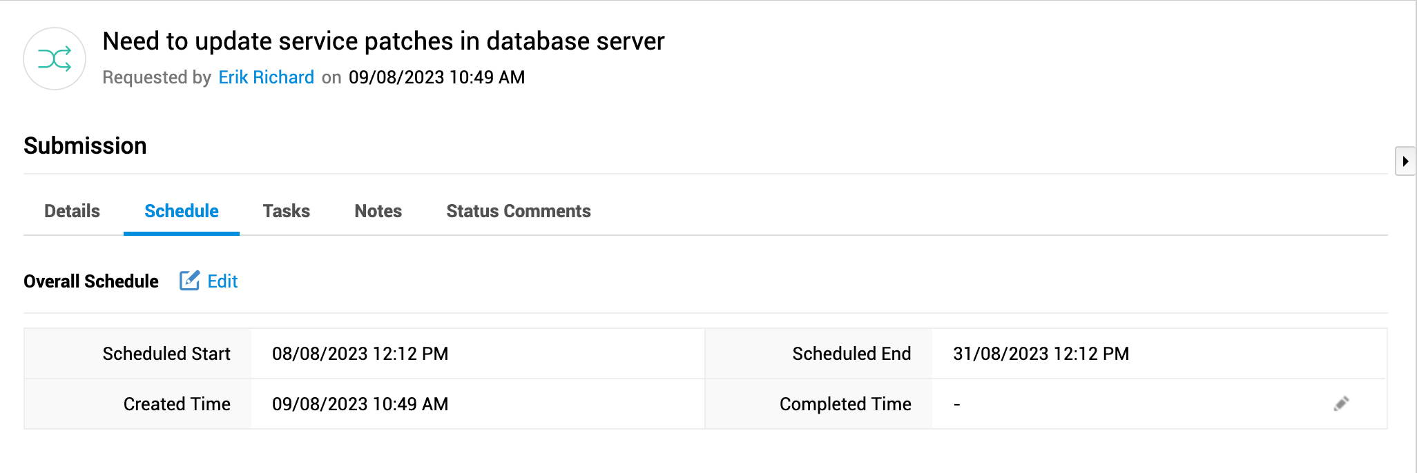 在提交变更请求时设置预期实施时间。您还可以记录变更的创建时间和完成时间。