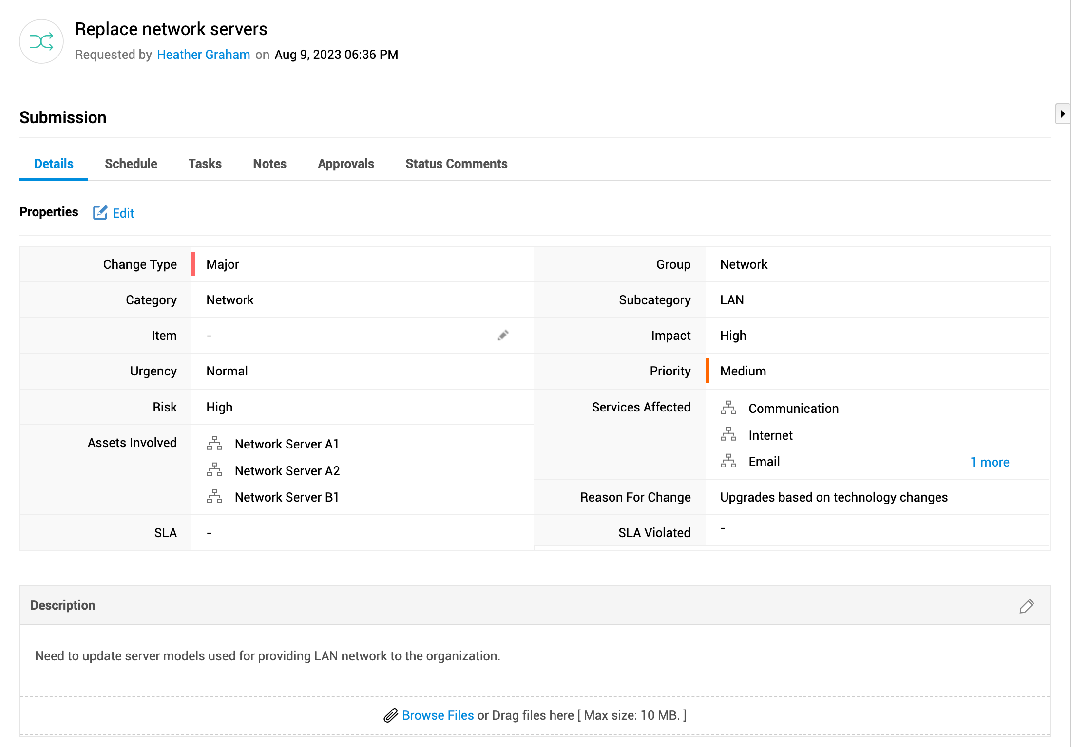 详细信息子选项卡会显示创建变更请求时定义的属性。您可以将变更的目标和指导原则记录为描述,或根据需要添加为附件。