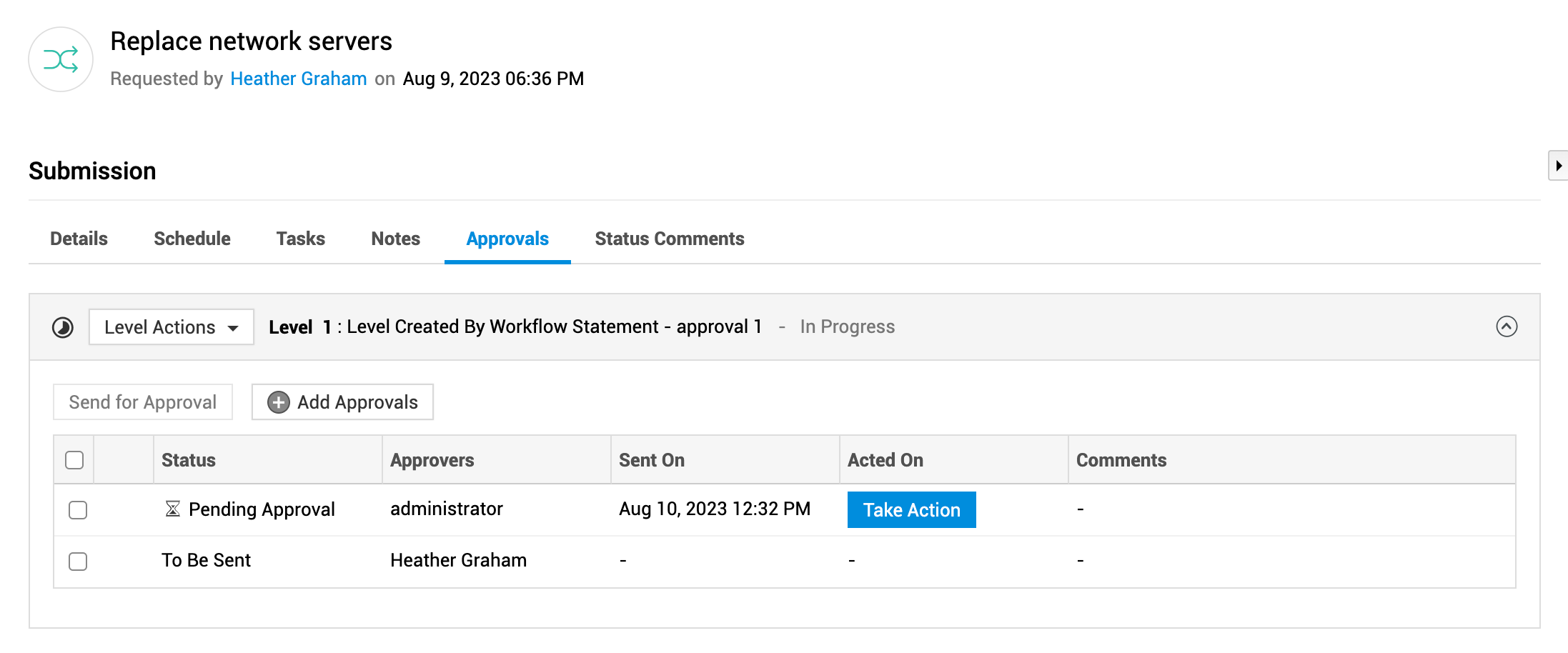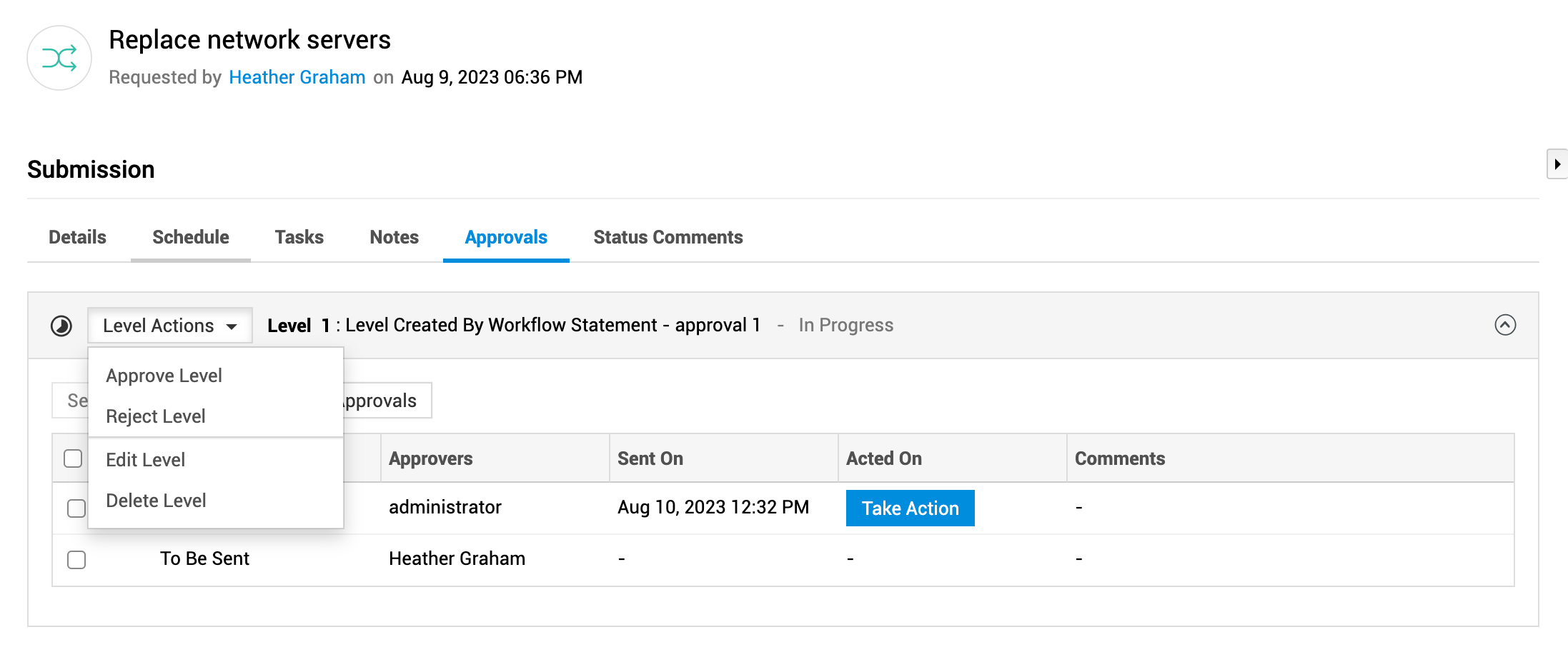 在级别操作下拉菜单中,您可以根据权限批准、拒绝、编辑或删除审批级别。