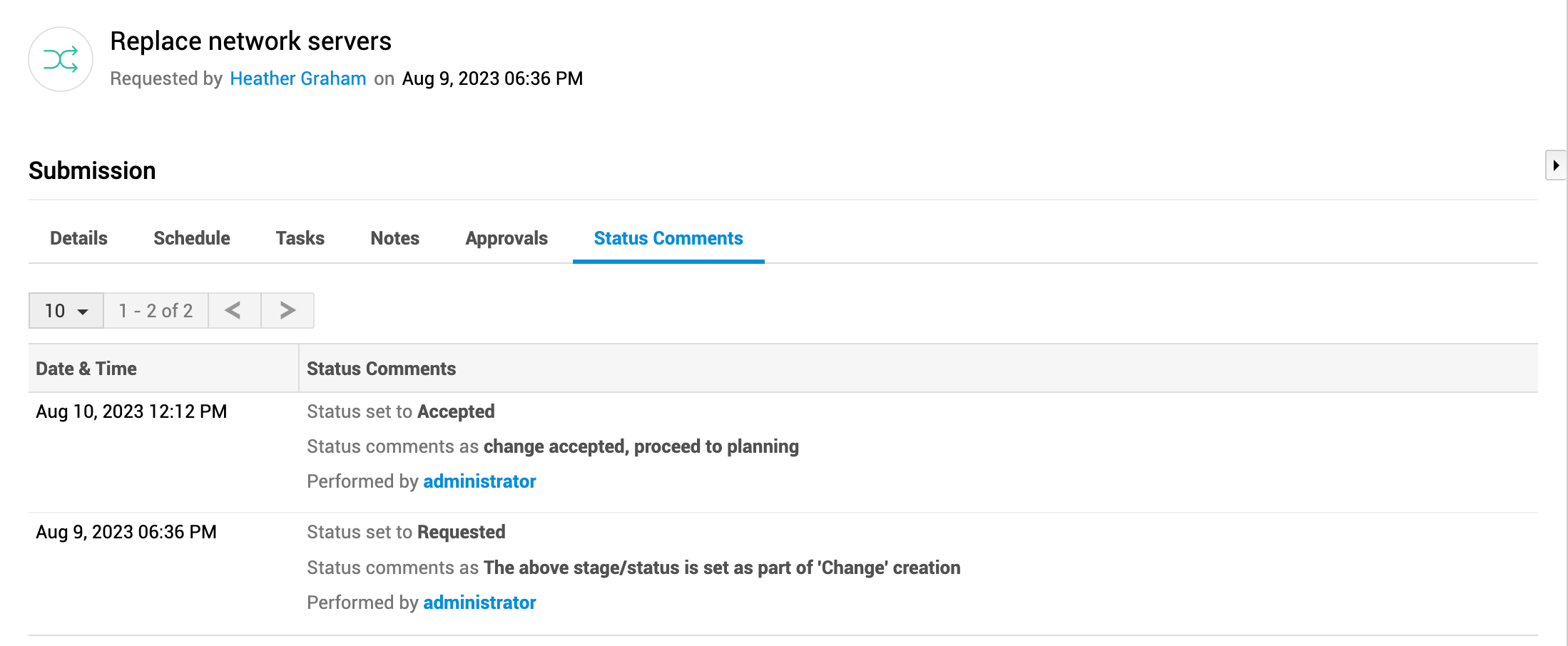 查看变更在提交阶段的状态转换,以及转换过程中添加的评论。